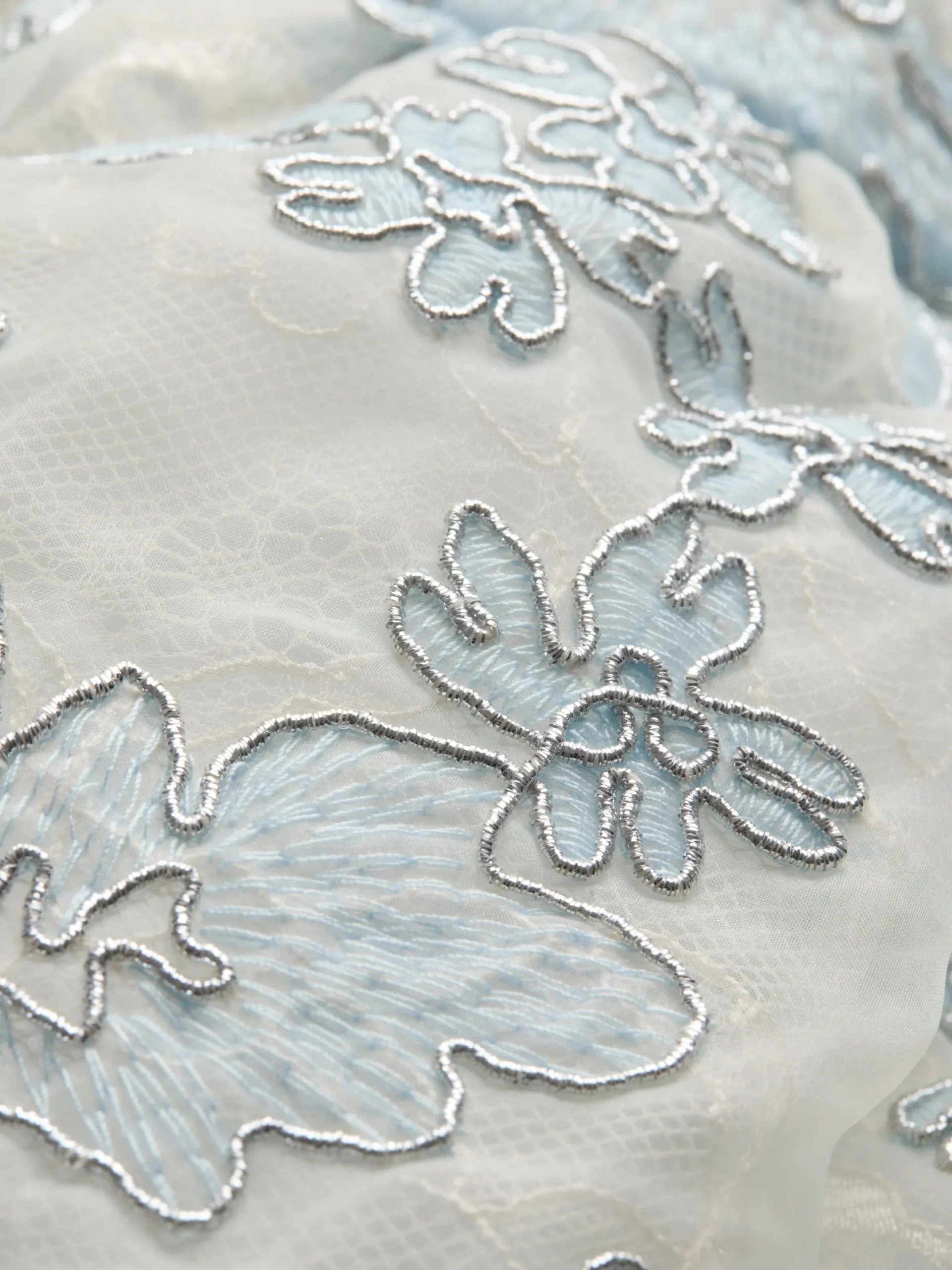 - Embroidered metallic corded lace on organza base